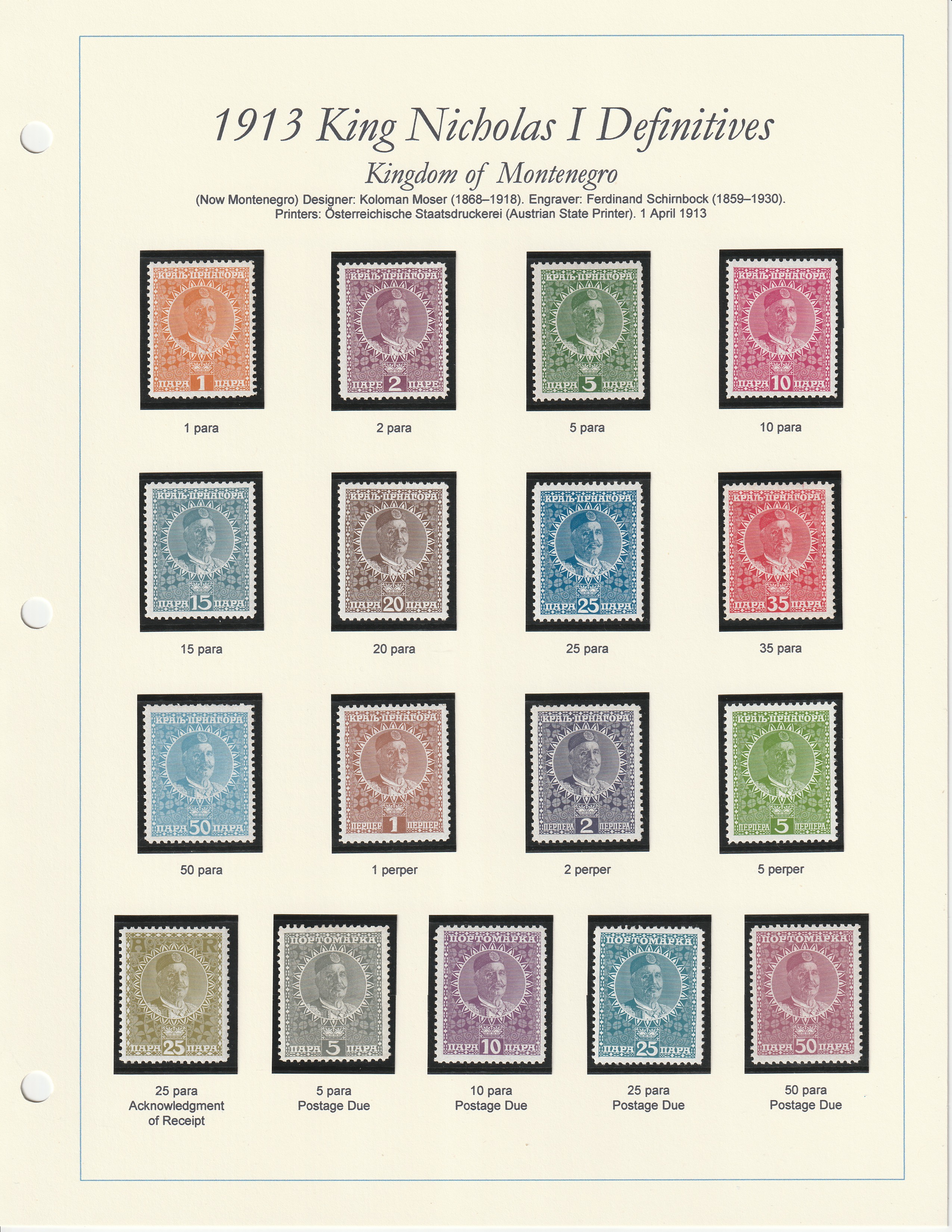 Definitives issued during the reign of King Nicholas I (1841–1921), the last monarch of Montenegro from 1860 to 1918, reigning as prince from 1860 to 1910 and as the country’s first and only king from 1910 to 1918.