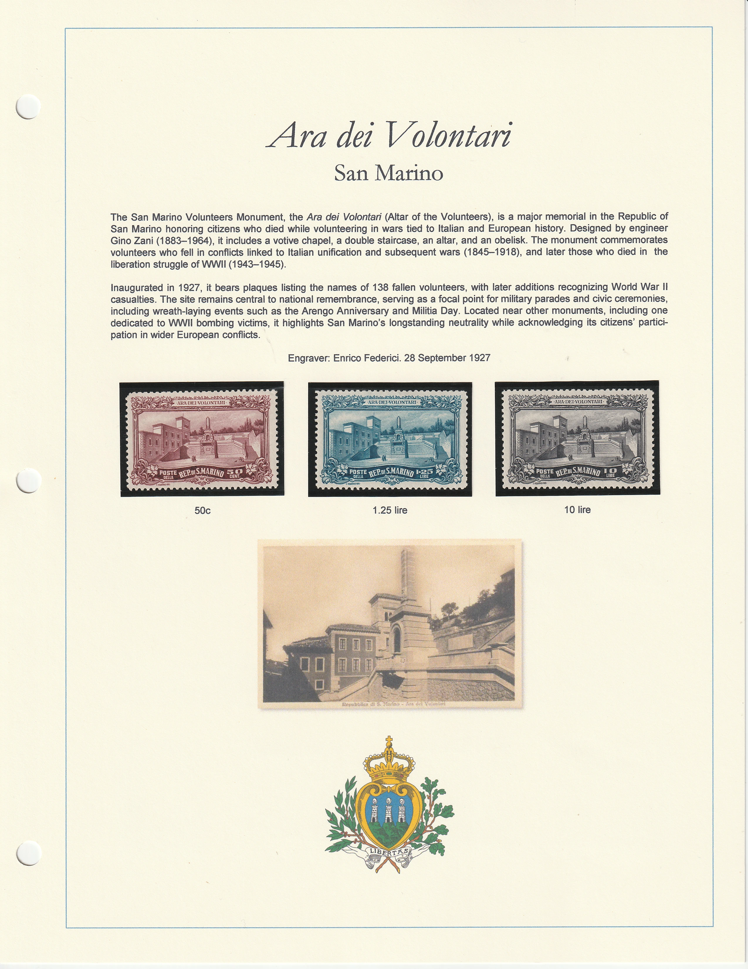 The San Marino Volunteers Monument, the Ara dei Volontari (Altar of the Volunteers), is a major memorial in the Republic of San Marino honoring citizens who died while volunteering in wars tied to Italian and European history. Designed by engineer Gino Zani (1883–1964), it includes a votive chapel, a double staircase, an altar, and an obelisk. The monument commemorates volunteers who fell in conflicts linked to Italian unification and subsequent wars (1845–1918), and later those who died in the liberation struggle of WWII (1943–1945).