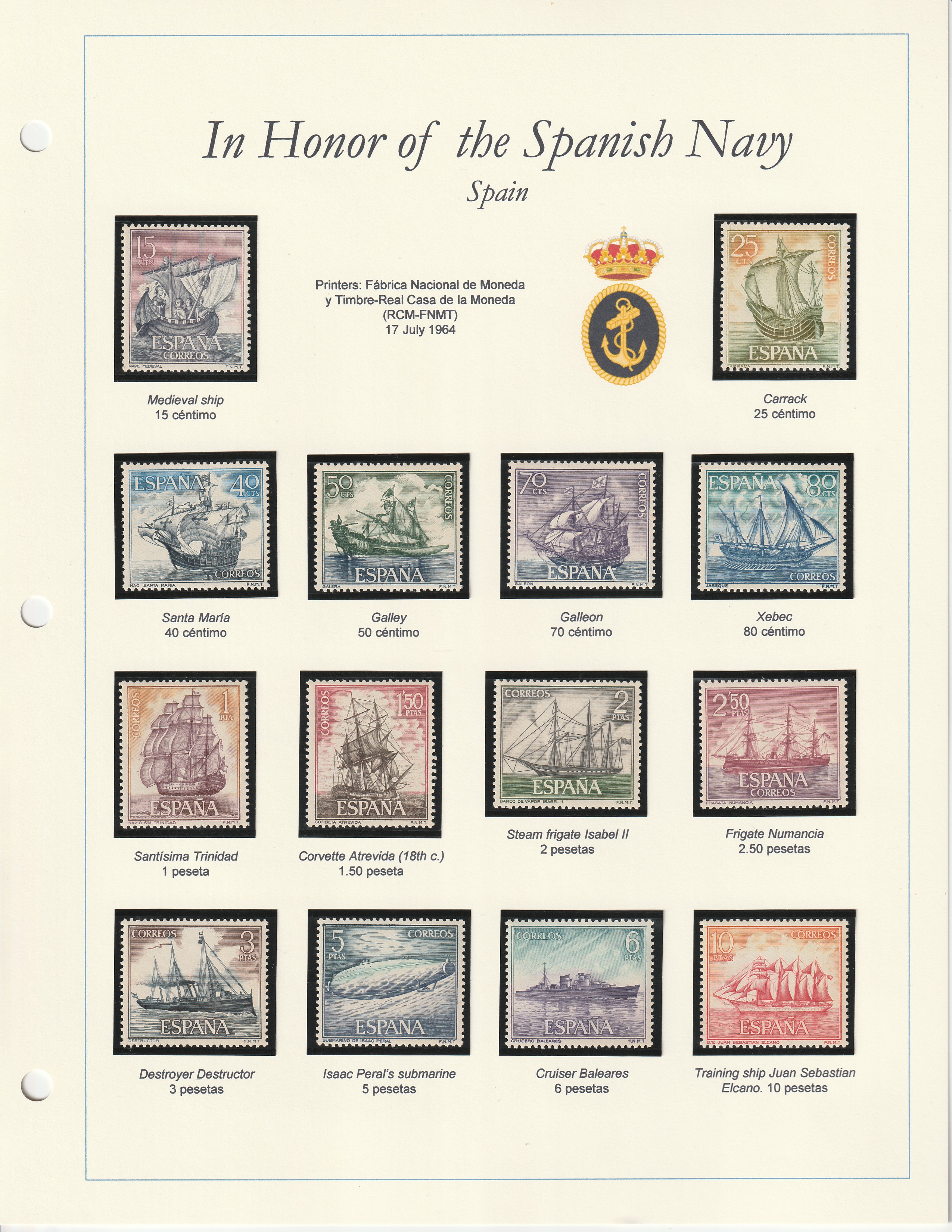 1964 Spanish Navy A set of 14 stamps issued by Spain in 1964 in honor of the history of the Spanish Navy. SpainBack to the Collections