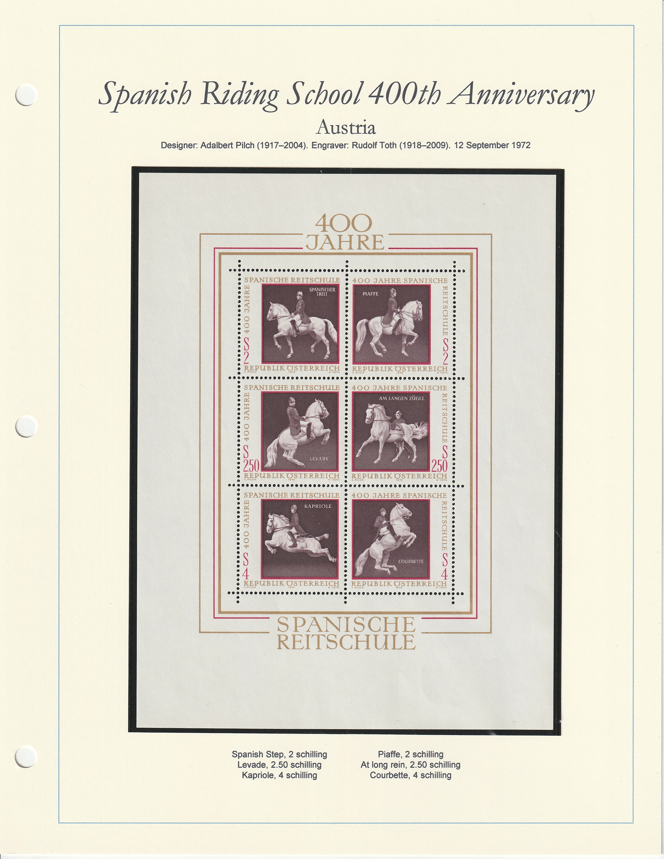 1972 Austria Spanish Riding School 400th Anniversary A souvenir sheet commemorating the 400th anniversary of the famous Spanish Riding School. Designed by Adalbert Pilch (1917–2004), engraved by Rudolf Toth (1918–2009), and issued 12 September 1972. AustriaBack to the Collections