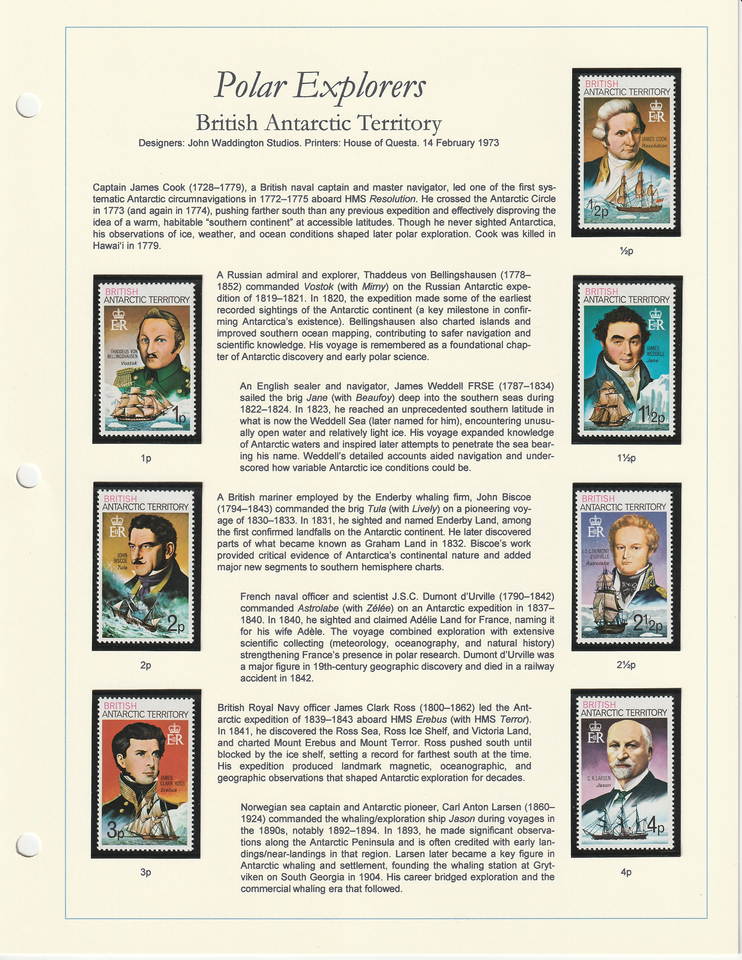 Celebrating the lives of fifteen polar explorers from the 18th to 20th centuries. Stamps designed by John Waddington Studios and printed by the House of Questa. Issued 14 February 1973.