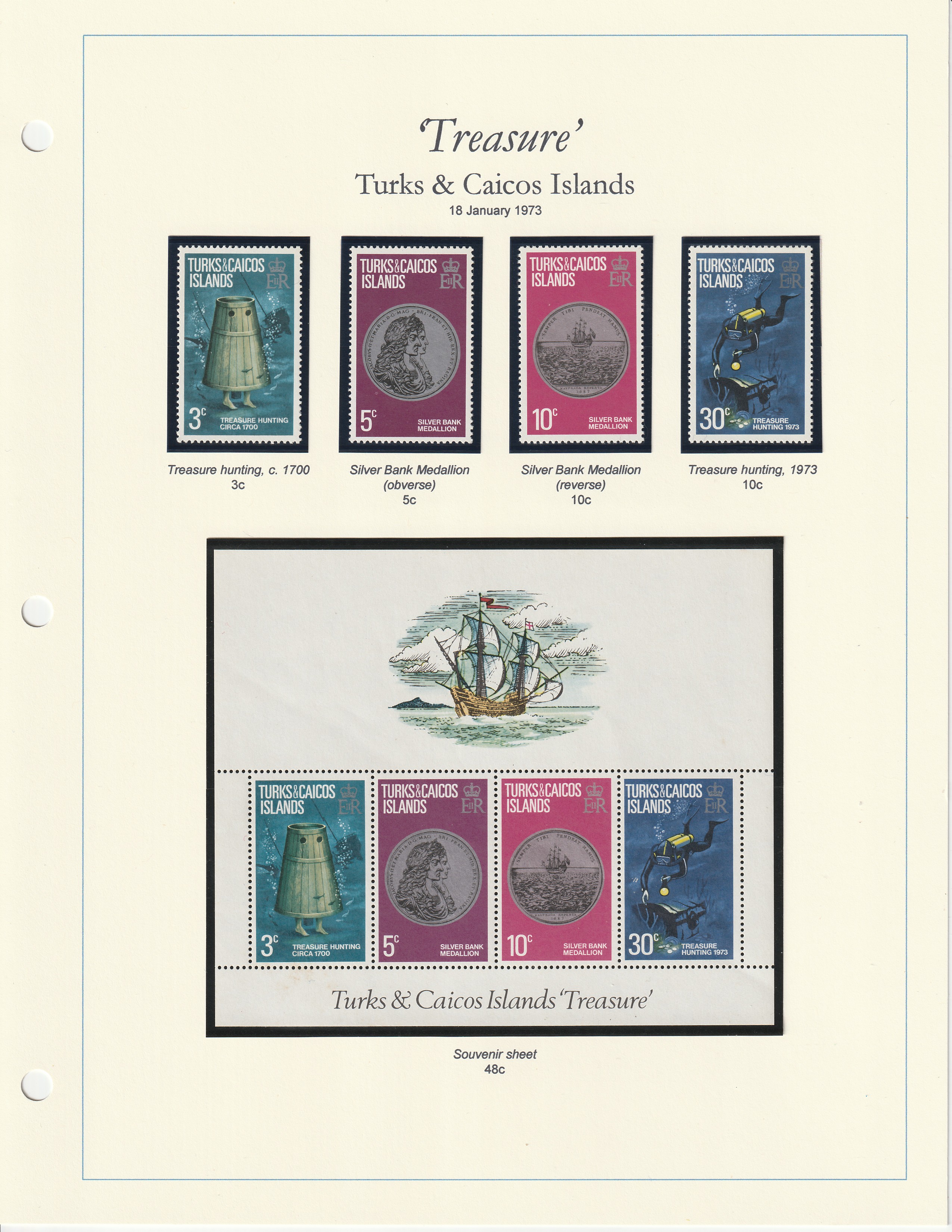 Treasure hunting and treasure found around the Islands. Silver Bank, near the Turks & Caicos, is famous for potential Spanish shipwreck treasures (gold, silver, artifacts) due to treacherous reefs, with famous finds including 17th-century galleon items like silver, jewelry, and porcelain, though many “treasures” are from other regions or misidentified, making it a magnet for treasure hunters seeking riches from history’s sunken galleons. Issued 18 January 1973.