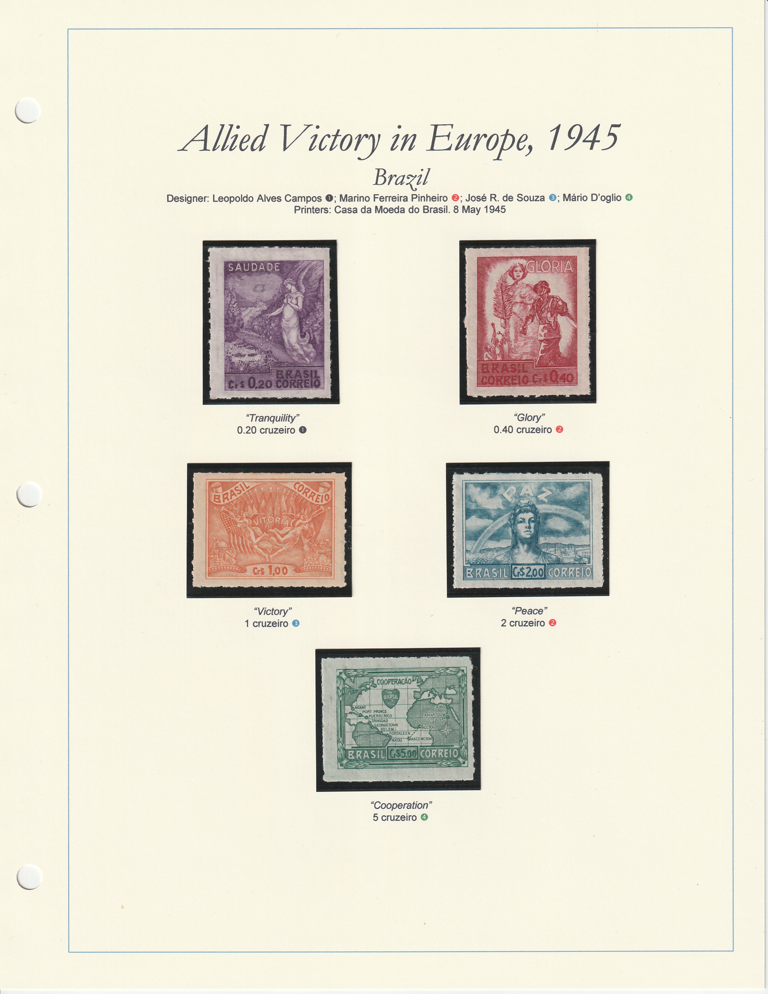 Allied Victory in Europe, 1945 1945 stamps issued by Brazil commemorating the Allied Victory in Europe in World War 2. Designed by Leopoldo Alves Campos, Marino Ferreira Pinheiro, José R. de Souza, and Mário D’oglio. Printed by Casa da Moeda do Brasil. BrazilBack to the Collections
