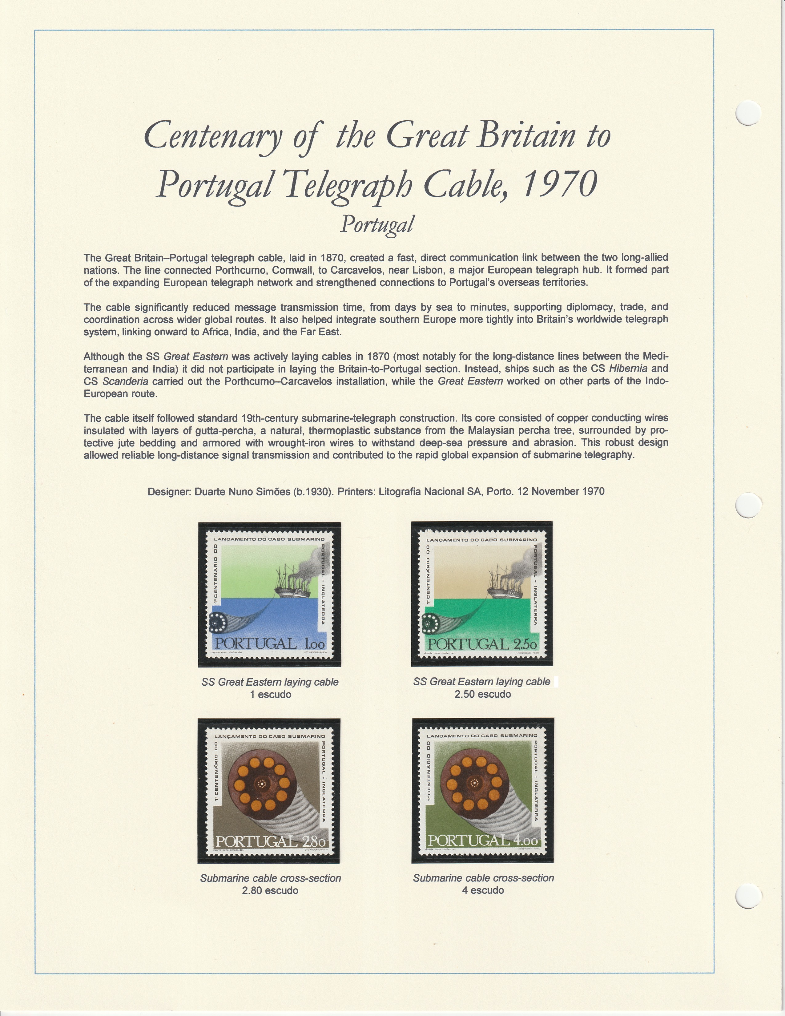 1 and 2.50 escudo stamps: Although the SS Great Eastern was actively laying cables in 1870 (most notably for the long-distance lines between the Mediterranean and India) it did not participate in laying the Britain-to-Portugal section. Instead, ships such as the CS Hibernia and CS Scanderia carried out the Porthcurno–Carcavelos installation, while the Great Eastern worked on other parts of the Indo-European route.
