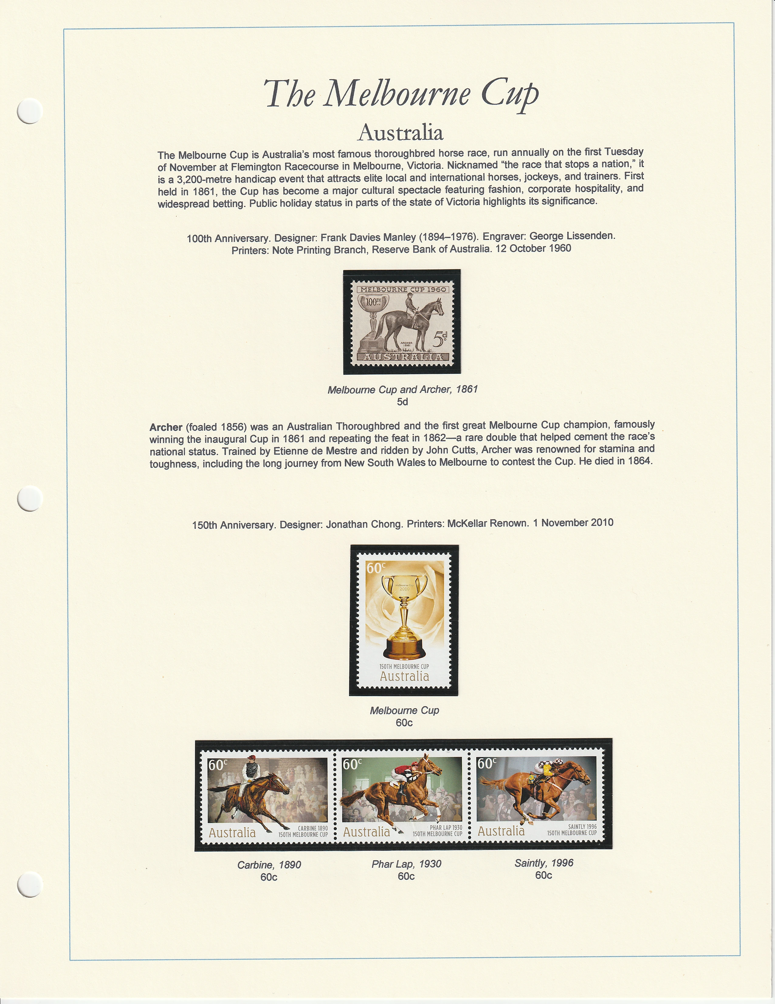 - Archer (foaled 1856, Melbourne Cup winner, 1861) was an Australian Thoroughbred and the first great Melbourne Cup champion, famously winning the inaugural Cup in 1861 and repeating the feat in 1862—a rare double that helped cement the race’s national status. Trained by Etienne de Mestre and ridden by John Cutts, Archer was renowned for stamina and toughness, including the long journey from New South Wales to Melbourne to contest the Cup. He died in 1864.